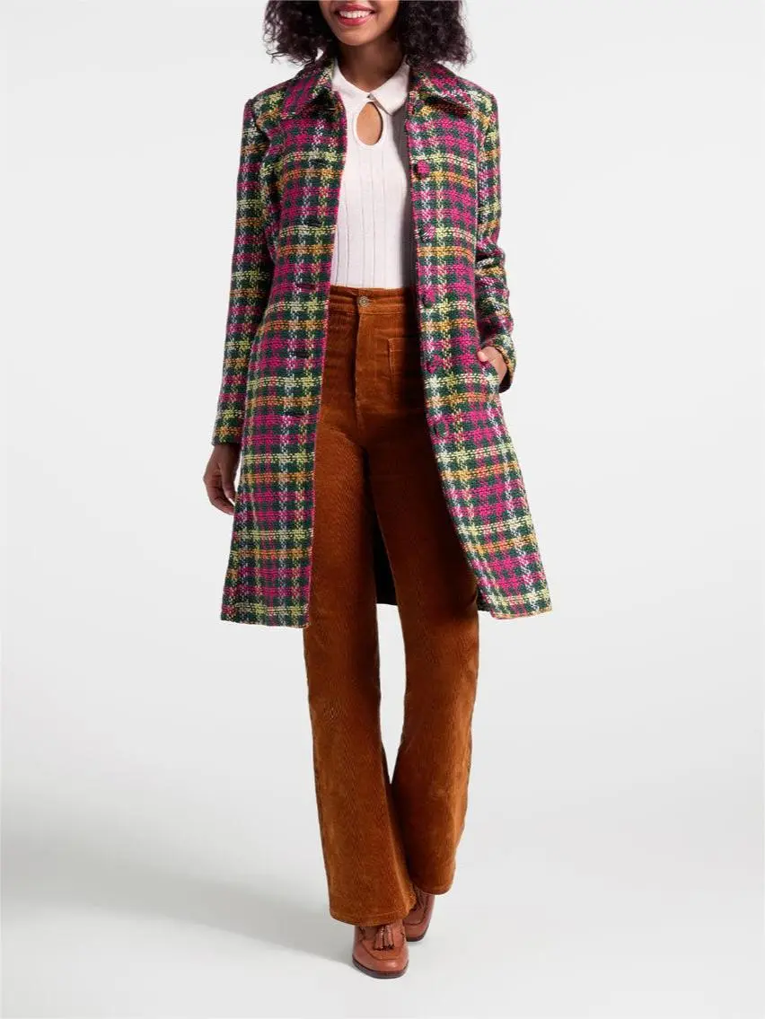 Made from a textured wool-blend fabric in a deep hunter green hue with a vibrant plaid print splashed in yellow, orange, and pink, this adorable A-line coat boasts a smart rounded collar, long sleeves, button-front closure, a matching and removable belt, handy side pockets, and a fit-and-flare skirted silhouette that finishes above the knee!