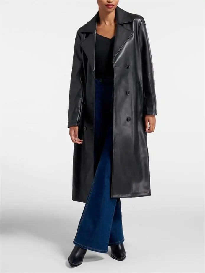 Boasting classic trench detailing that includes double-breasted button closure, a wide notched-lapel collar, handy side pockets, and a retro-chic mid-calf length, this faux-leather coat has a slightly oversized silhouette and a whole lot of attitude.
